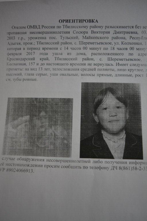 В Тбилисском районе пропали двое несовершеннолетних четырнадцатилетний Сергей и тринадцатилетняя Виктория Сосюра. Дети вместе с матерью проживали на территории села Шереметьевского около трёх месяцев.