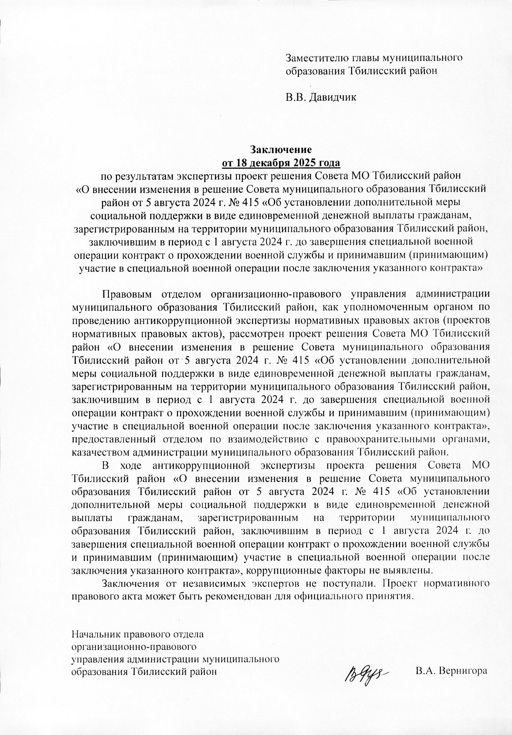 О внесении изменения в решение Совета муниципального образования Тбилисский район от 5 августа 2024 г. № 415 «Об установлении дополнительной меры социальной поддержки в виде единовременной денежной выплаты гражданам, зарегистрированным на территории муниципального образования Тбилисский район, заключившим в период с 1 августа 2024 г. до завершения специальной военной операции контракт о прохождении военной службы и принимавшим (принимающим) участие в специальной военной операции после заключения указанного контракта»
