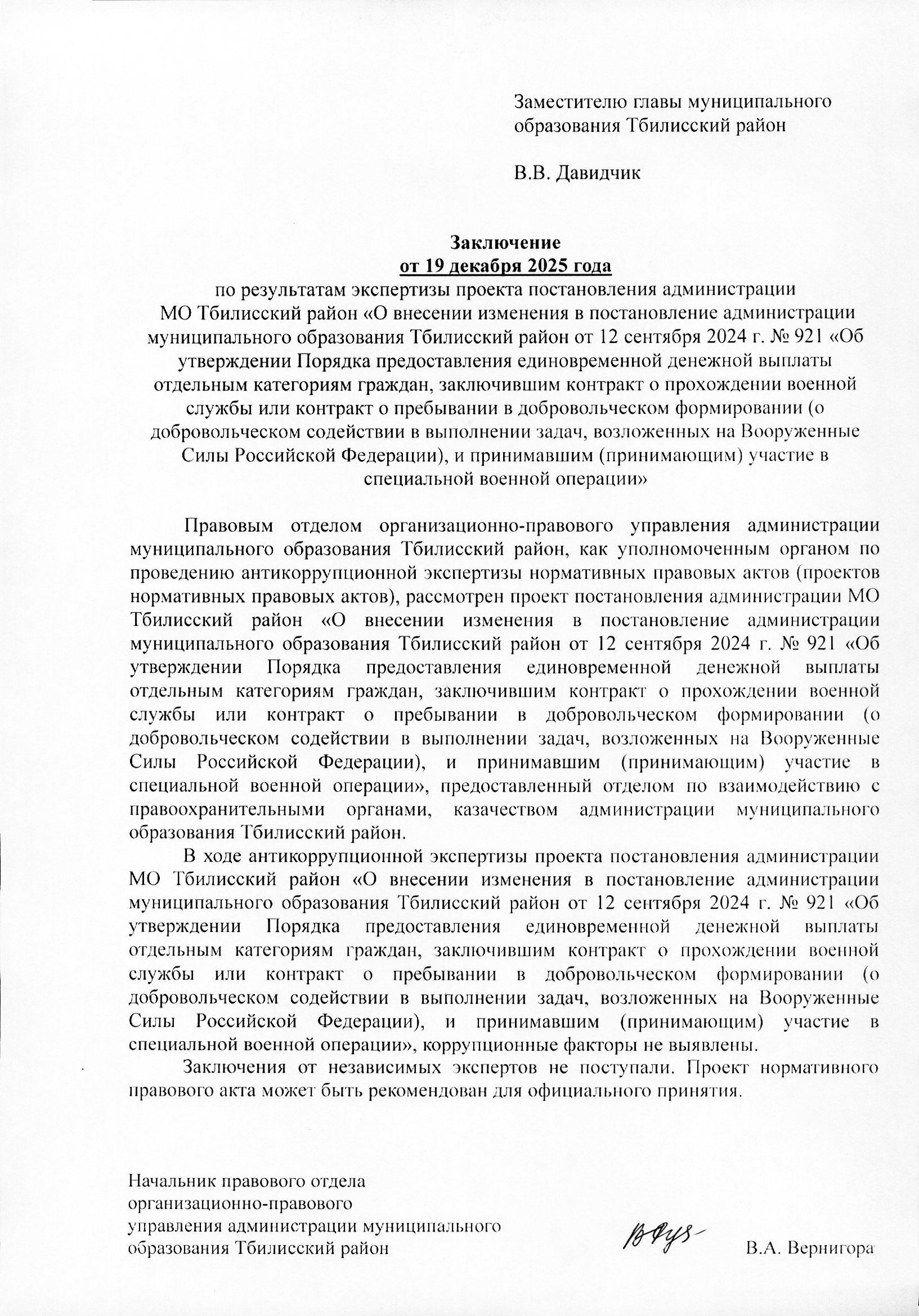 О внесении изменения в постановление администрации муниципального образования Тбилисский район от 12 сентября 2024 г. № 921 «Об утверждении Порядка предоставления единовременной денежной выплаты отдельным категориям граждан, заключившим контракт о прохождении военной службы или контракт о пребывании в добровольческом формировании (о добровольческом содействии в выполнении задач, возложенных на Вооруженные Силы Российской Федерации), и принимавшим (принимающим) участие в специальной военной операции»