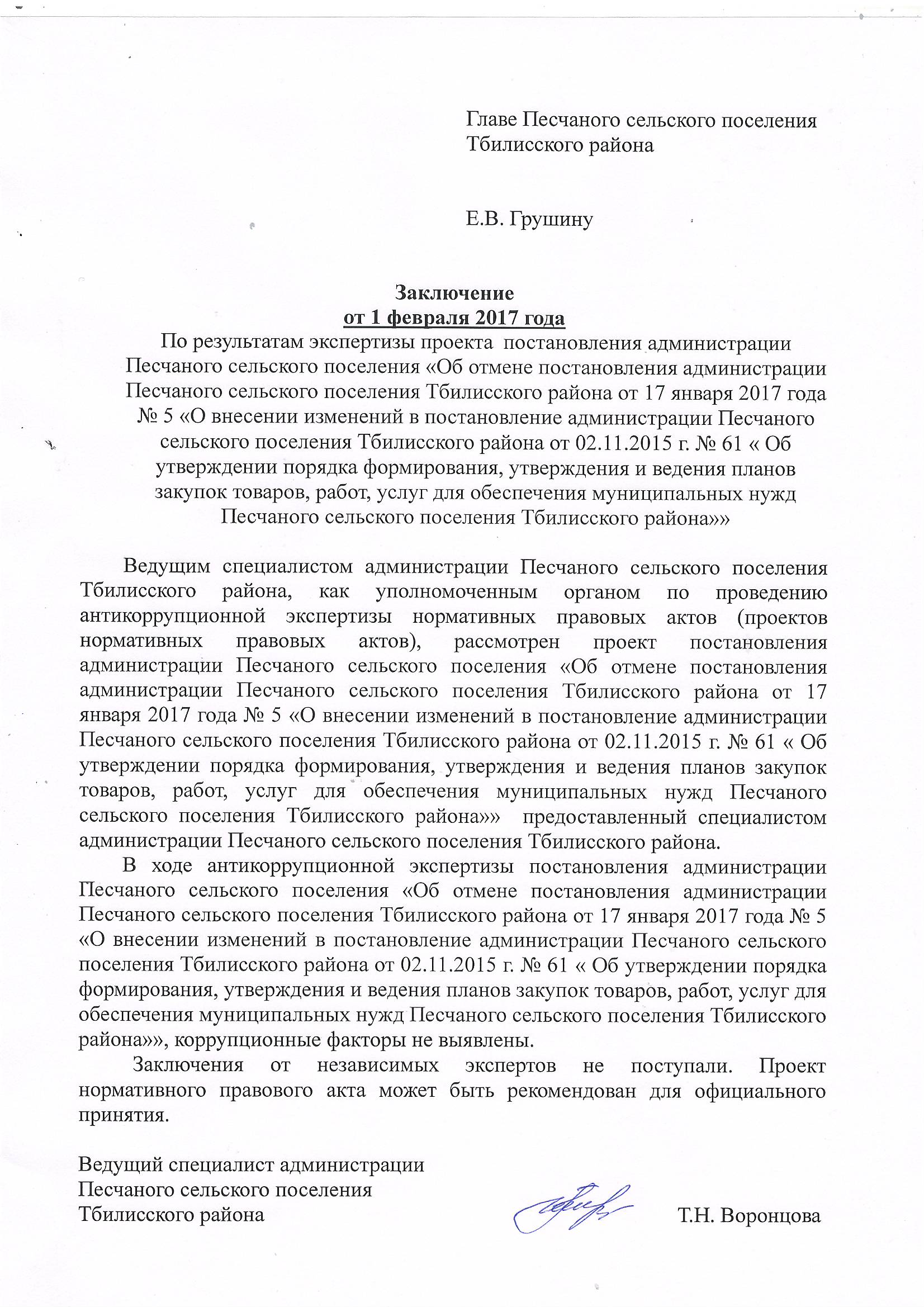 Об отмене постановления администрации Песчаного сельского поселения Тбилисского района от 17 января 2017 года № 5 «О внесении изменений в постановление администрации Песчаного сельского поселения Тбилисского района от 02.11.2015 г. № 61 « Об утверждении порядка формирования, утверждения и ведения планов закупок товаров, работ, услуг для обеспечения муниципальных нужд Песчаного сельского поселения Тбилисского района»