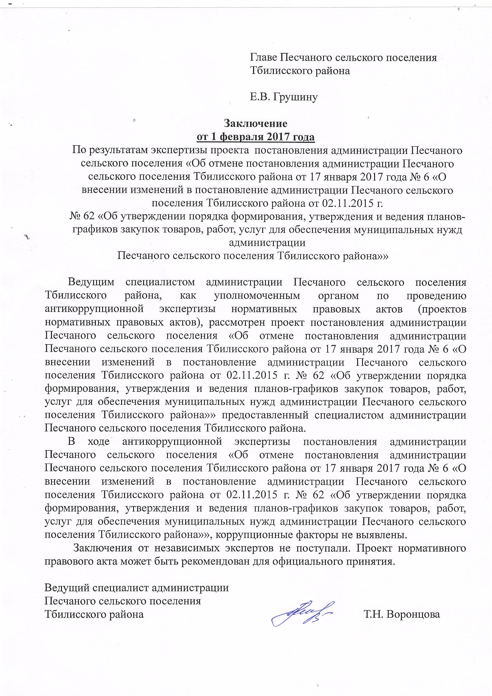 Об отмене постановления администрации Песчаного сельского поселения Тбилисского района от 17 января 2017 года № 6 «О внесении изменений в постановление администрации Песчаного сельского поселения Тбилисского района от 02.11.2015 г. № 62 «Об утверждении порядка формирования, утверждения и ведения планов-графиков закупок товаров, работ, услуг для обеспечения муниципальных нужд администрации Песчаного сельского поселения Тбилисского района»