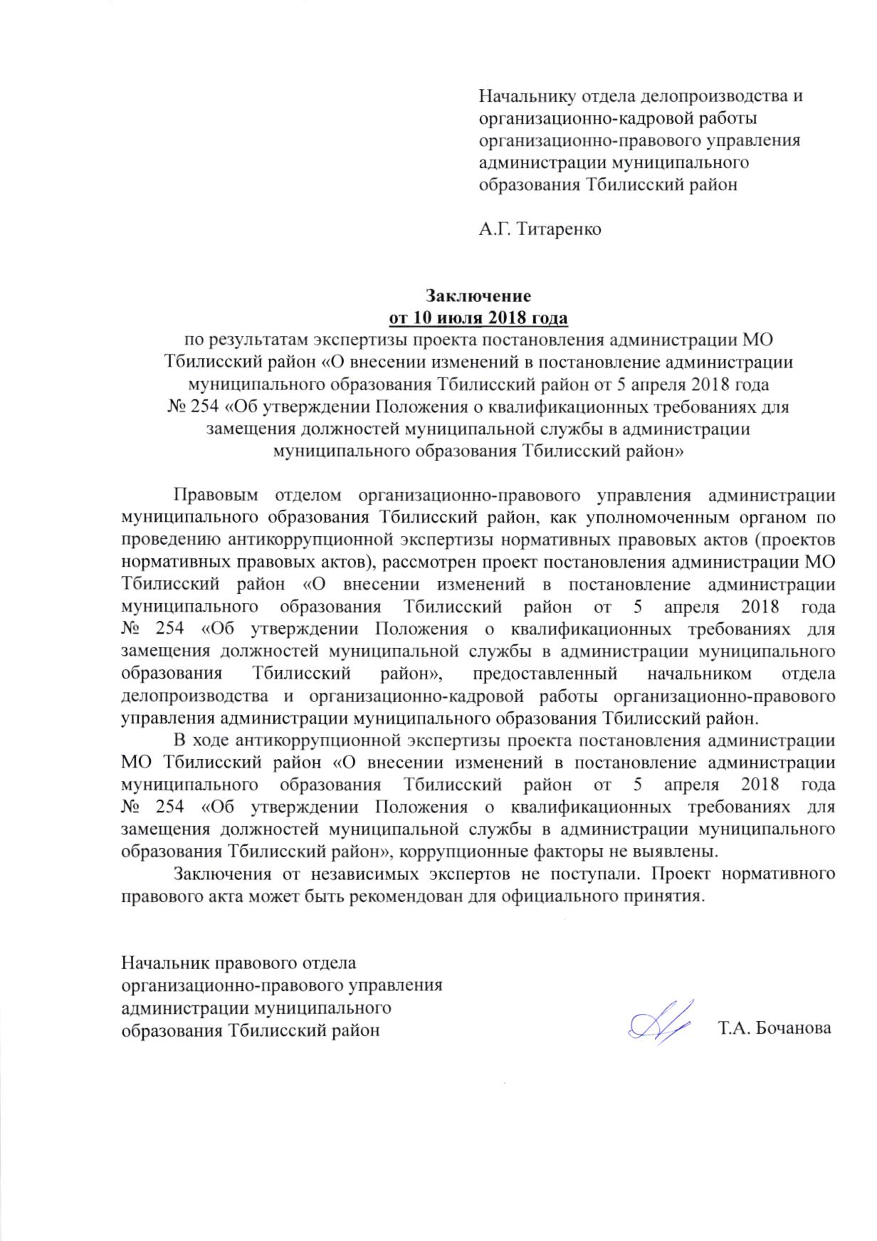 О внесении изменения в постановление администрации муниципального образования Тбилисский район от 5 апреля 2018 года № 254 «Об утверждении Положения о квалификационных требованиях для замещения должностей муниципальной службы в администрации муниципального образования Тбилисский район»