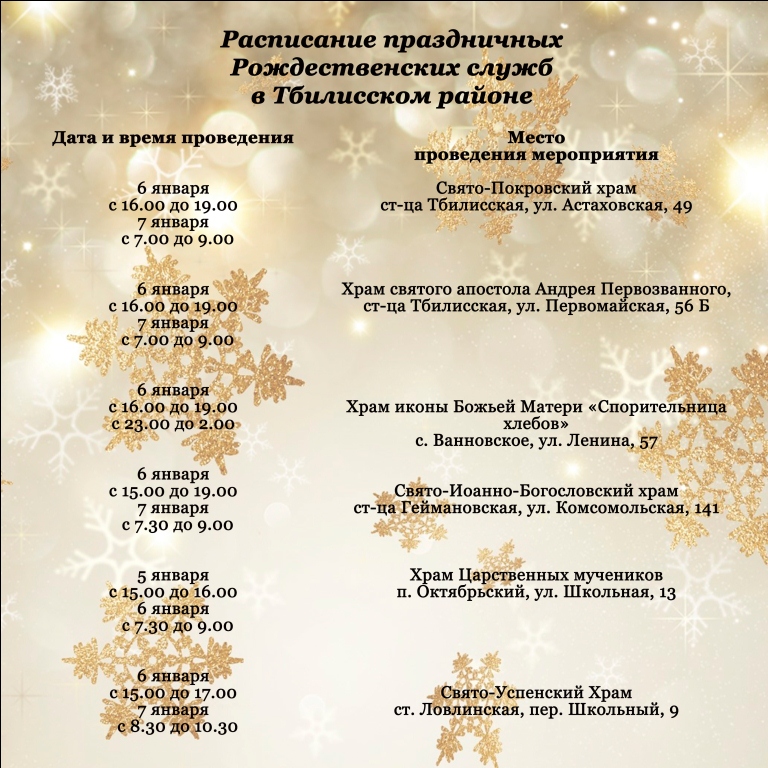 Расписание праздничных Рождественских служб в Тбилисском районе