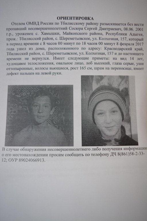 В Тбилисском районе пропали двое несовершеннолетних четырнадцатилетний Сергей и тринадцатилетняя Виктория Сосюра. Дети вместе с матерью проживали на территории села Шереметьевского около трёх месяцев.