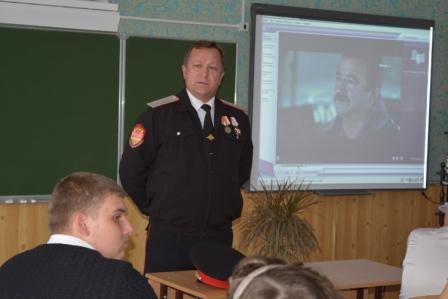 Атаман Ванновского хуторского казачьего общества Сергей Пархоменко рассказал ученикам 7-х классов четвертой школы о событиях, предшествующих воссоединению Крыма с Россией. Ребята с интересом слушали о том, как три года назад казаки Тбилисского района защищали границы Крыма. Как они вместе с казаками из других районов и местными отрядами самообороны обеспечивали правопорядок. За участие в этом историческом событии, атаман награжден благодарственным письмом Президента Российской Федерации, ему вручены медали «За возвращение Крыма» и «За защиту Крыма».