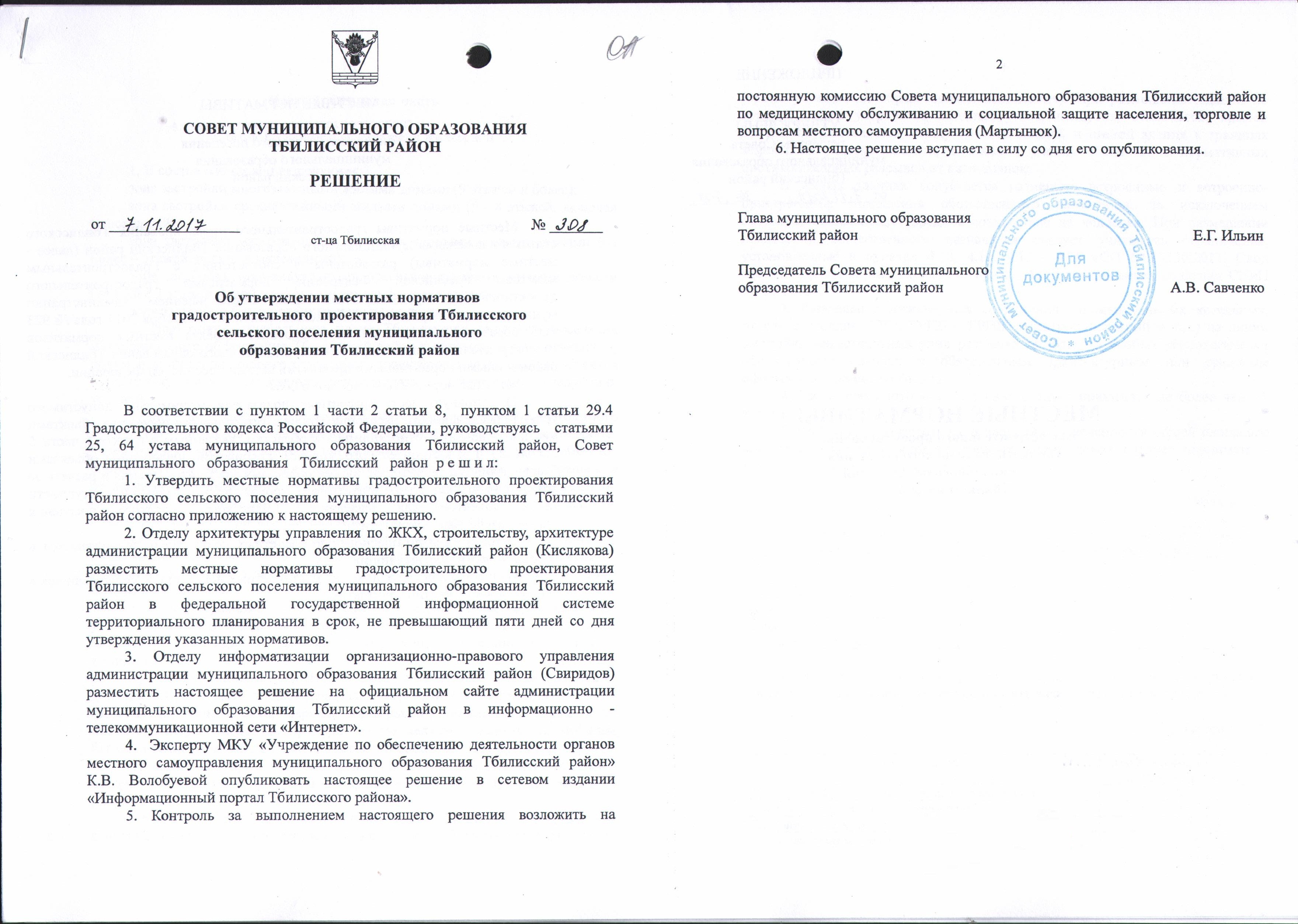 Решение Совета муниципального образования Тбилисский район от 07.11.2017 г. № 308 "Об утверждении местных нормативов градостроительного проектирования Тбилисского сельского поселения муниципального образования Тбилисский район" |