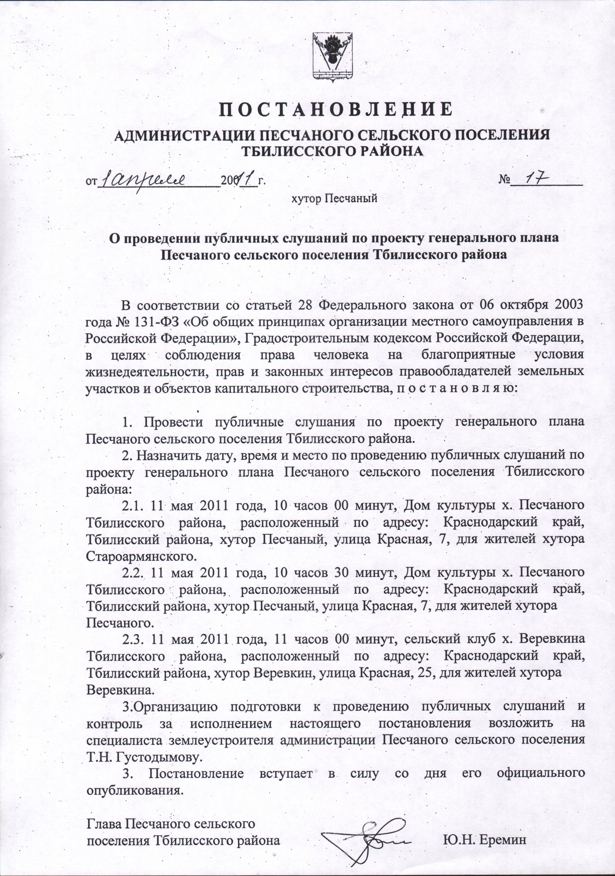 Постановление администрации Песчаного сельского поселения Тбилисского района от 01 апреля 2011 года № 17 "О проведении публичных слушаний по проекту генерального плана Песчаного сельского поселения Тбилисского района |