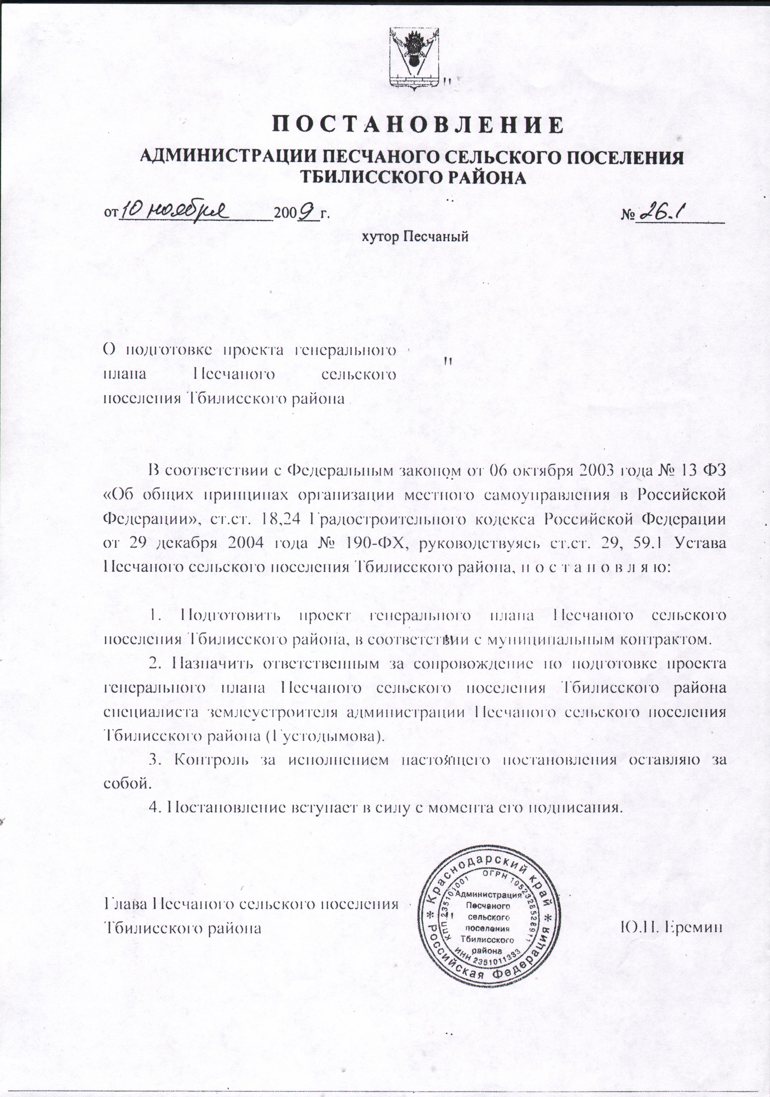 Постановление администрации Песчаного сельского поселения Тбилисского района от 10 ноября 2009 года № 26.1 "О подготовке проекта генерального плана Песчаного сельского поселения Тбилисского района" |