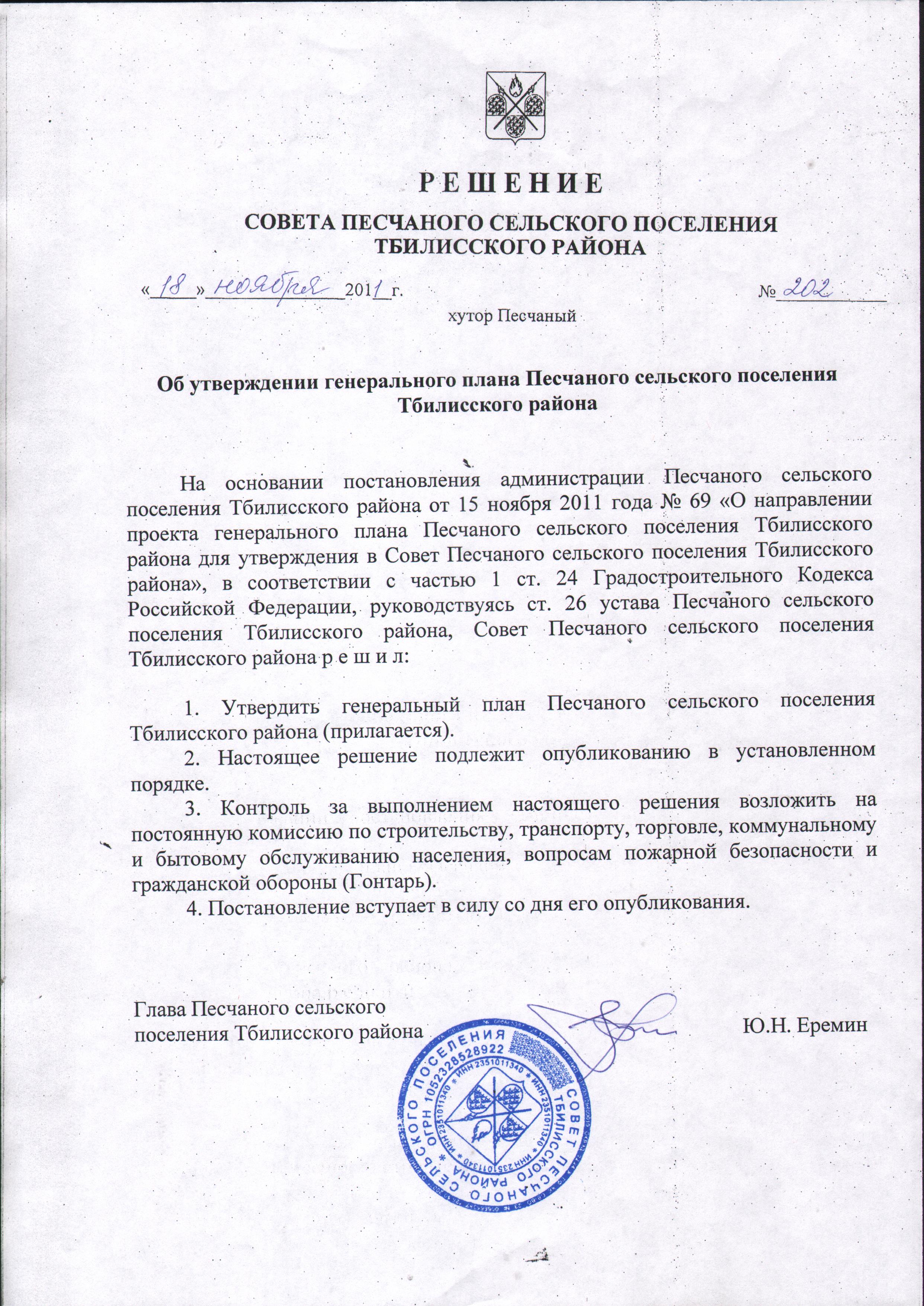 Решение Совета Песчаного сельского поселения Тбилисского района от 18 ноября 2011 года № 202 "Об утверждении генерального плана Песчаного сельского поселения Тбилисского района Скачать |