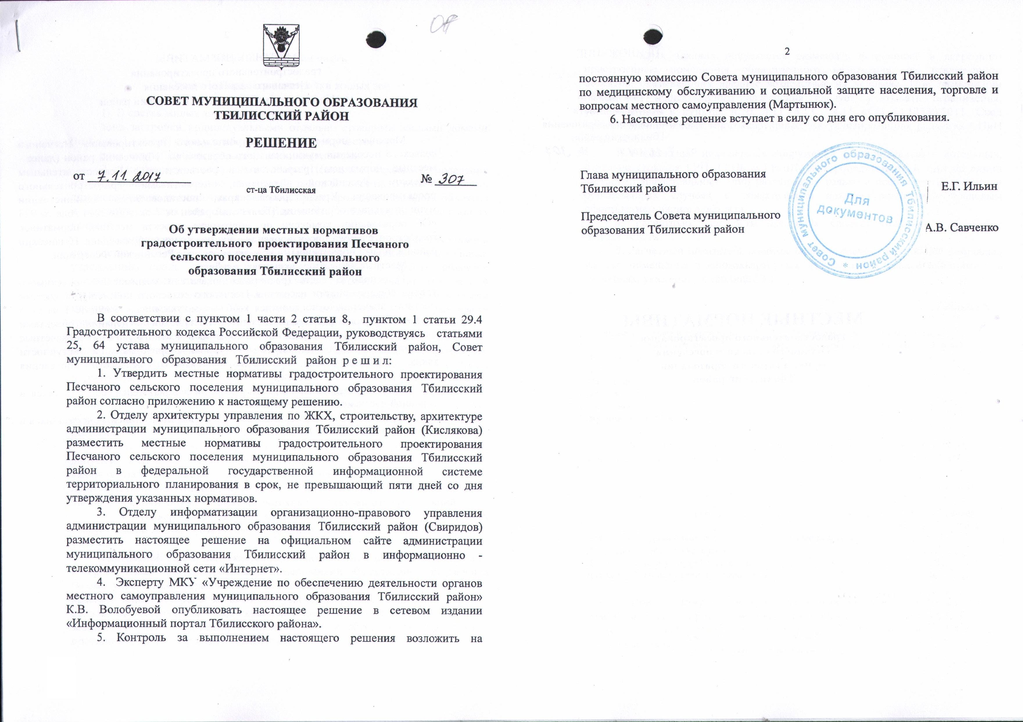 Решение Совета муниципального образования Тбилисский район от 07.11.2017 г. № 307 "Об утверждении местных нормативов градостроительного проектирования Песчаного сельского поселения муниципального образования Тбилисский район" |
