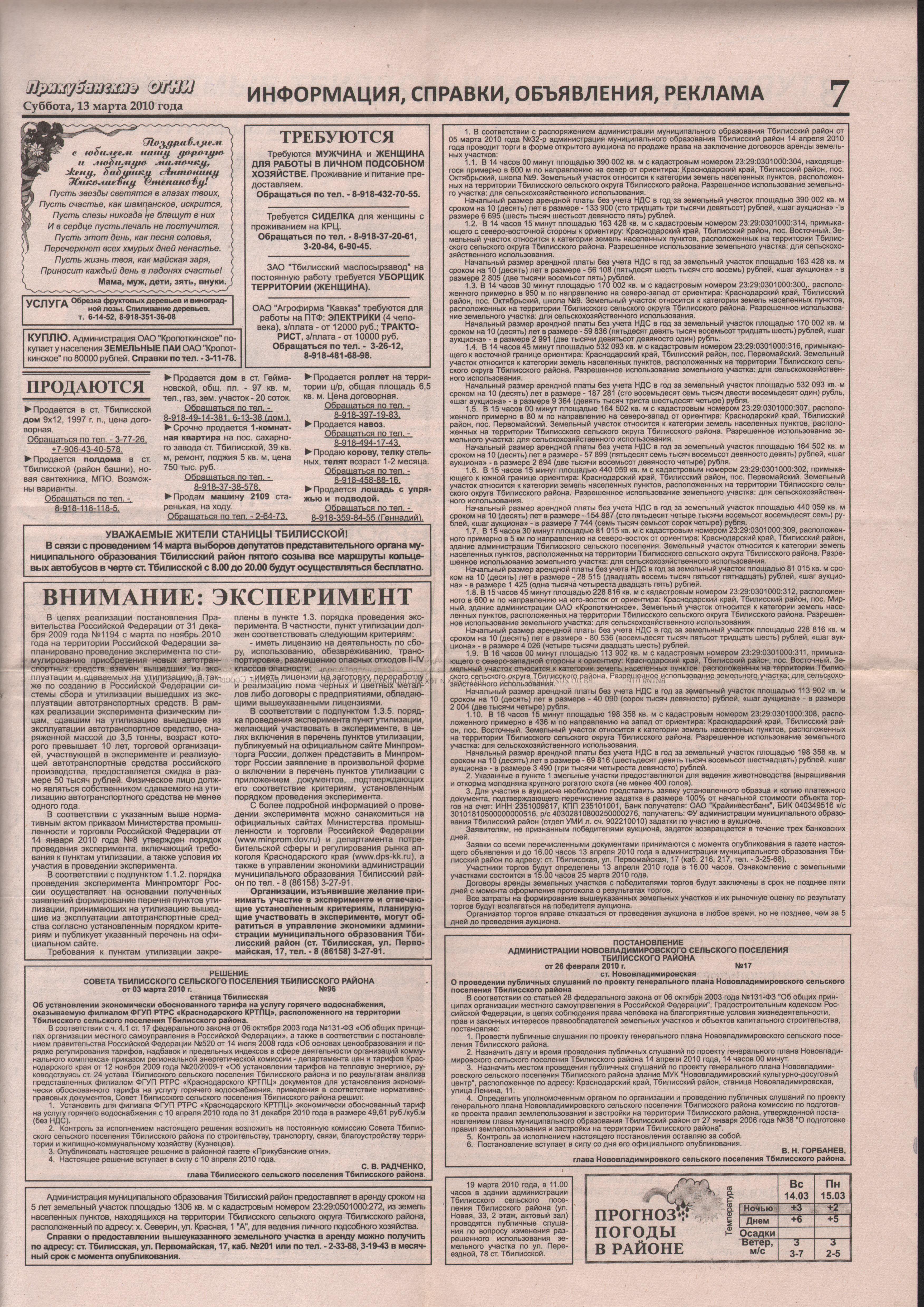 Постановление администрации Нововладимировского сельского поселения Тбилисского района от 26 февраля 2010 года № 17 "О проведении публичных слушаний по проекту генерального плана Нововладимировского сельского поселения Тбилисского района |