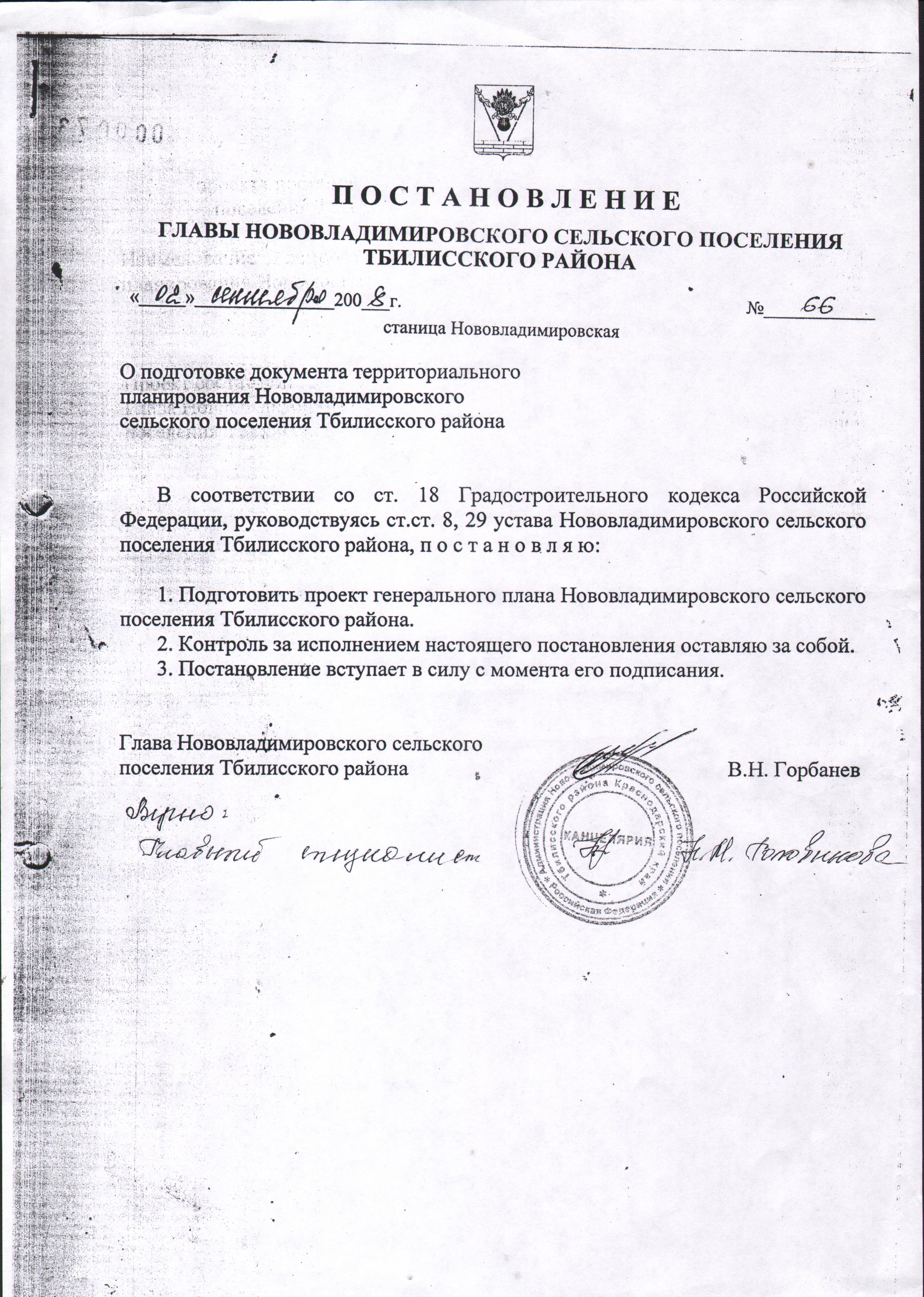 Постановление главы Нововладимировского сельского поселения Тбилисского района от 02 сентября 2008 года № 66 "О подготовке документа территориального планирования Нововладимировского сельского поселения Тбилисского района" |