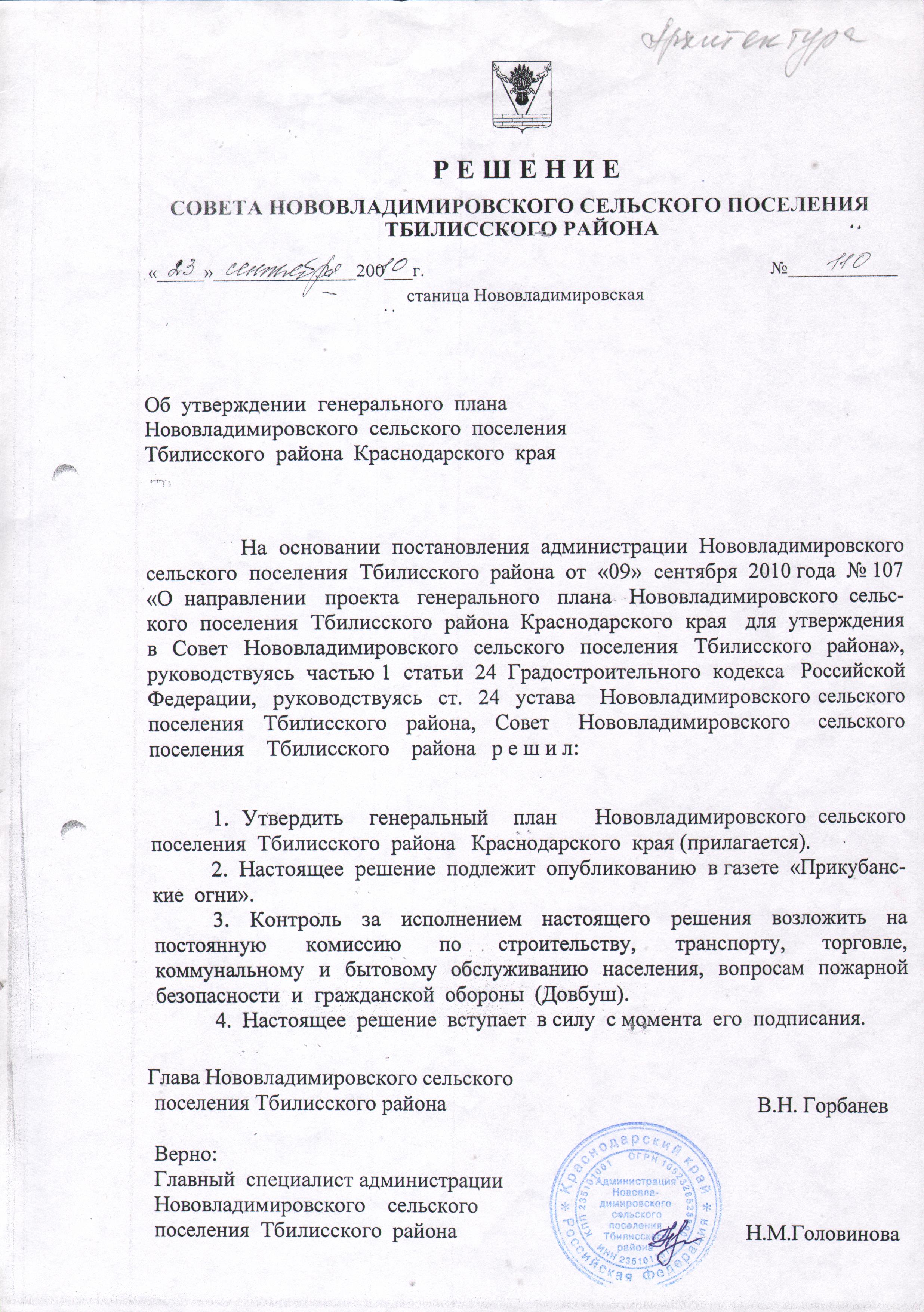 Решение Совета Нововладимировского сельского поселения Тбилисского района от 23 сентября 2010 года № 110 "Об утверждении генерального плана Нововладимировского сельского поселения Тбилисского района Краснодарского края Скачать |