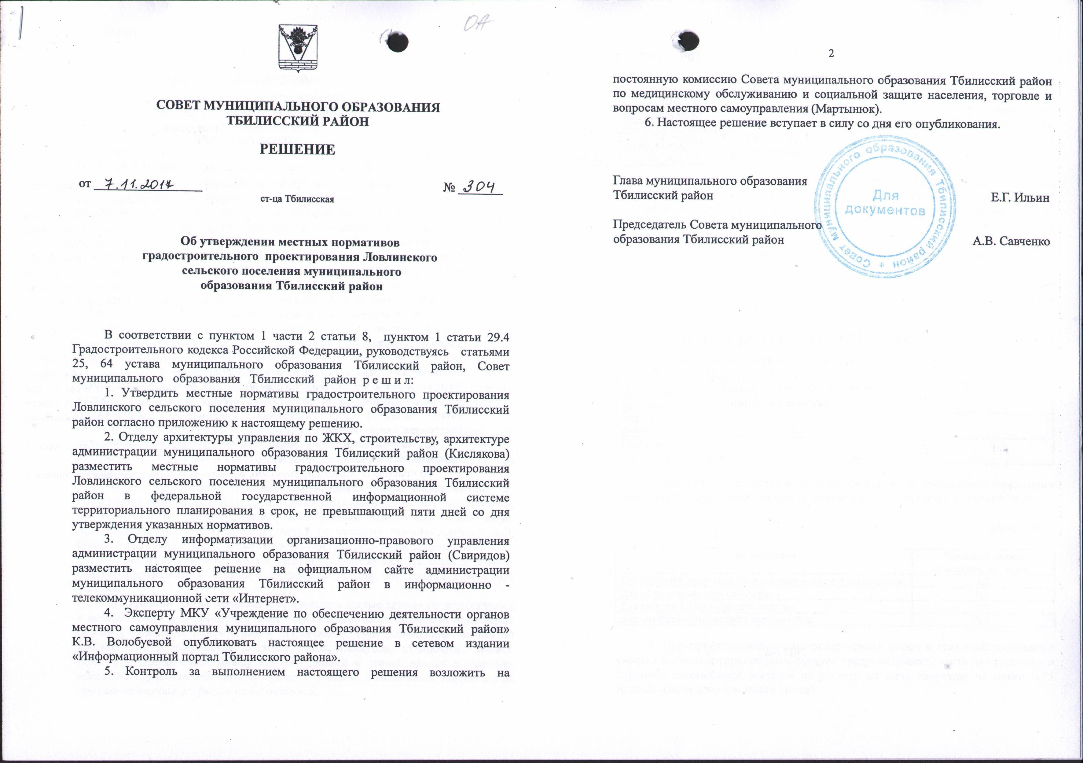 Решение Совета муниципального образования Тбилисский район от 07.11.2017 г. № 304 "Об утверждении местных нормативов градостроительного проектирования Ловлинского сельского поселения муниципального образования Тбилисский район" |