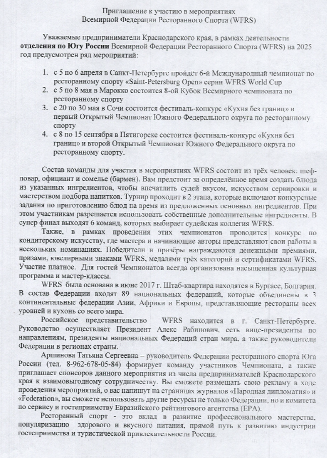 18.02.2025 Приглашение к участию в мероприятиях Всемирной Федерации Ресторанного Спорта