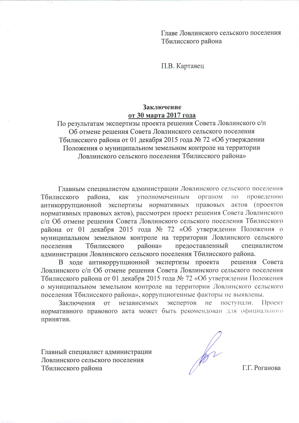 Об отмене решения Совета Ловлинского сельского поселения Тбилисского района от 01 декабря 2015 года № 72 «Об утверждении Положения о муниципальном земельном контроле на территории Ловлинского сельского поселения Тбилисского района»