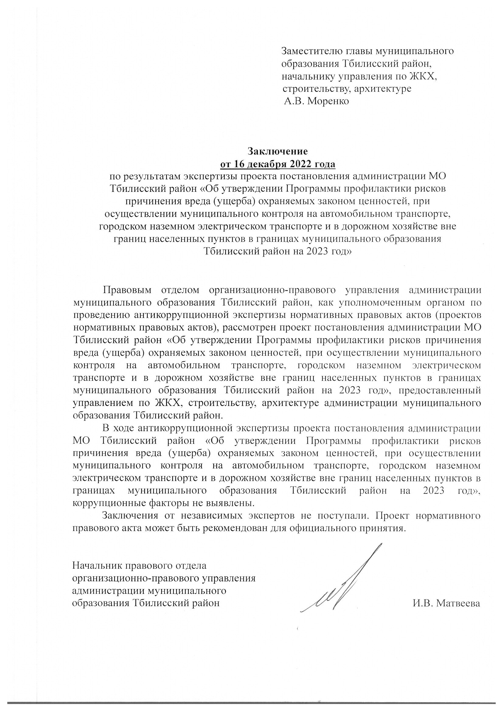Об утверждении Программы профилактики рисков причинения вреда (ущерба) охраняемых законом ценностей, при осуществлении муниципального контроля на автомобильном транспорте, городском наземном электрическом транспорте и в дорожном хозяйстве вне границ населенных пунктов в границах муниципального образования Тбилисский район на 2023 год