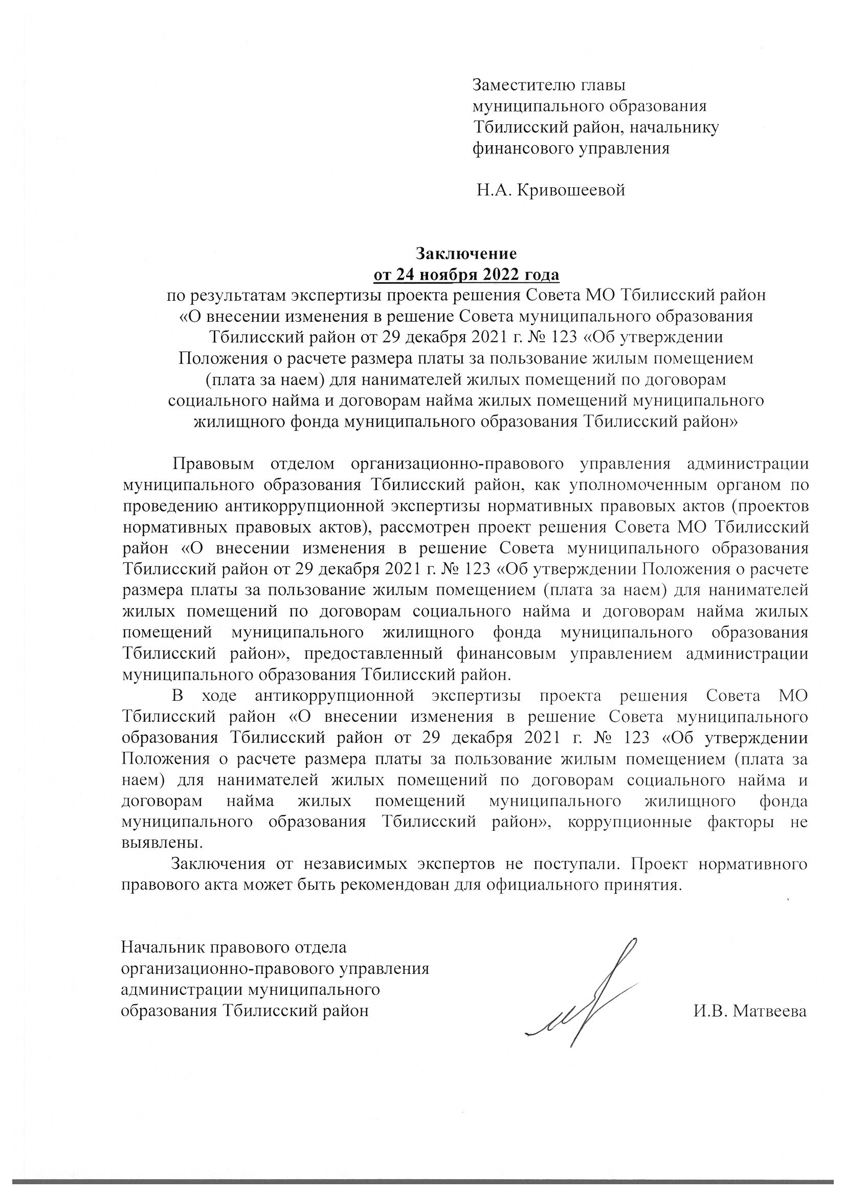 О внесении изменения в решение Совета муниципального образования Тбилисский район от 29 декабря 2021 г. № 123 «Об утверждении Положения о расчете размера платы за пользование жилым помещением (плата за наем) для нанимателей жилых помещений по договорам социального найма и договорам найма жилых помещений муниципального жилищного фонда муниципального образования Тбилисский район»