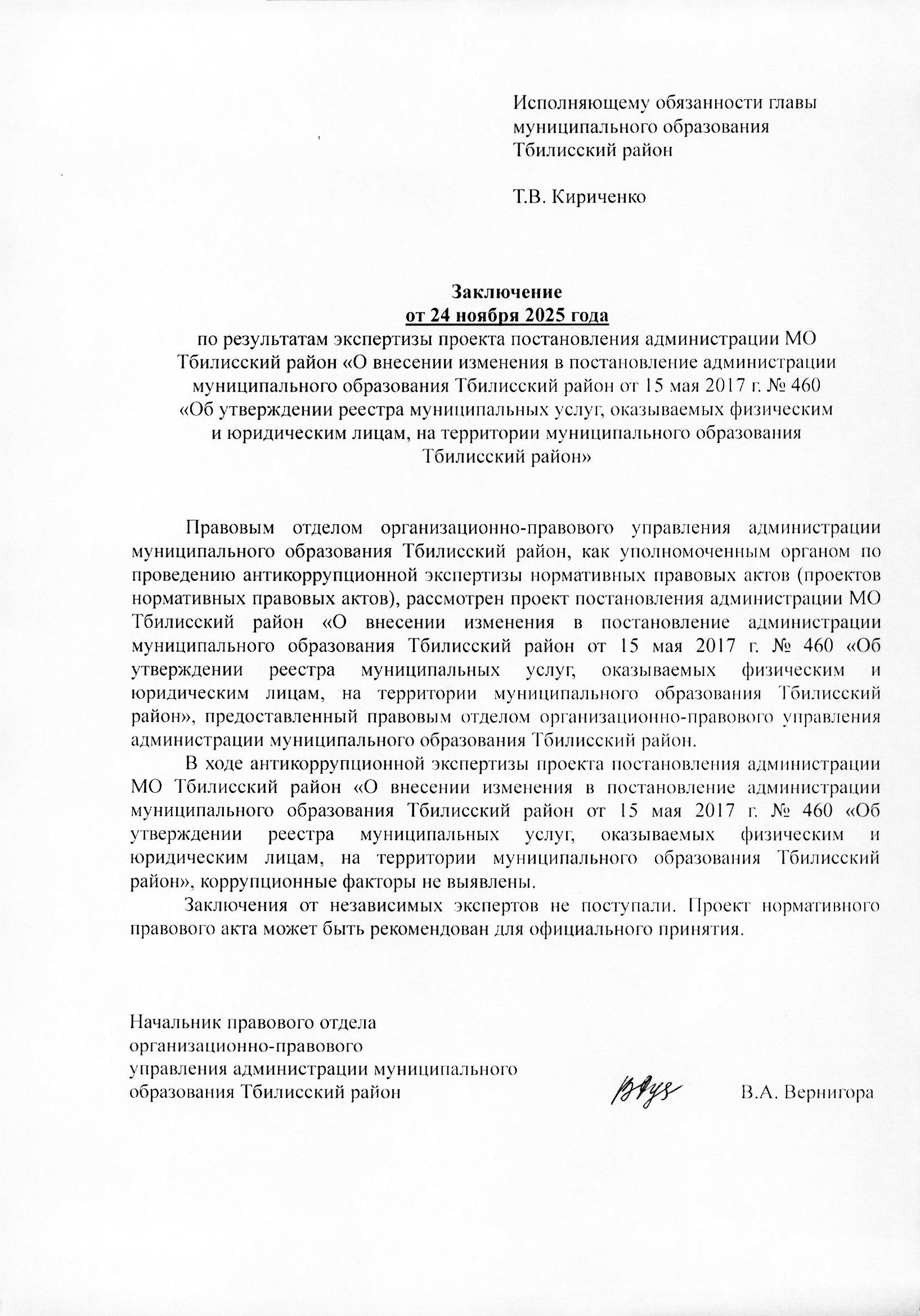 О внесении изменения в постановление администрации муниципального образования Тбилисский район от 15 мая 2017 г. № 460 «Об утверждении реестра муниципальных услуг, оказываемых физическим и юридическим лицам, на территории муниципального образования Тбилисский район»