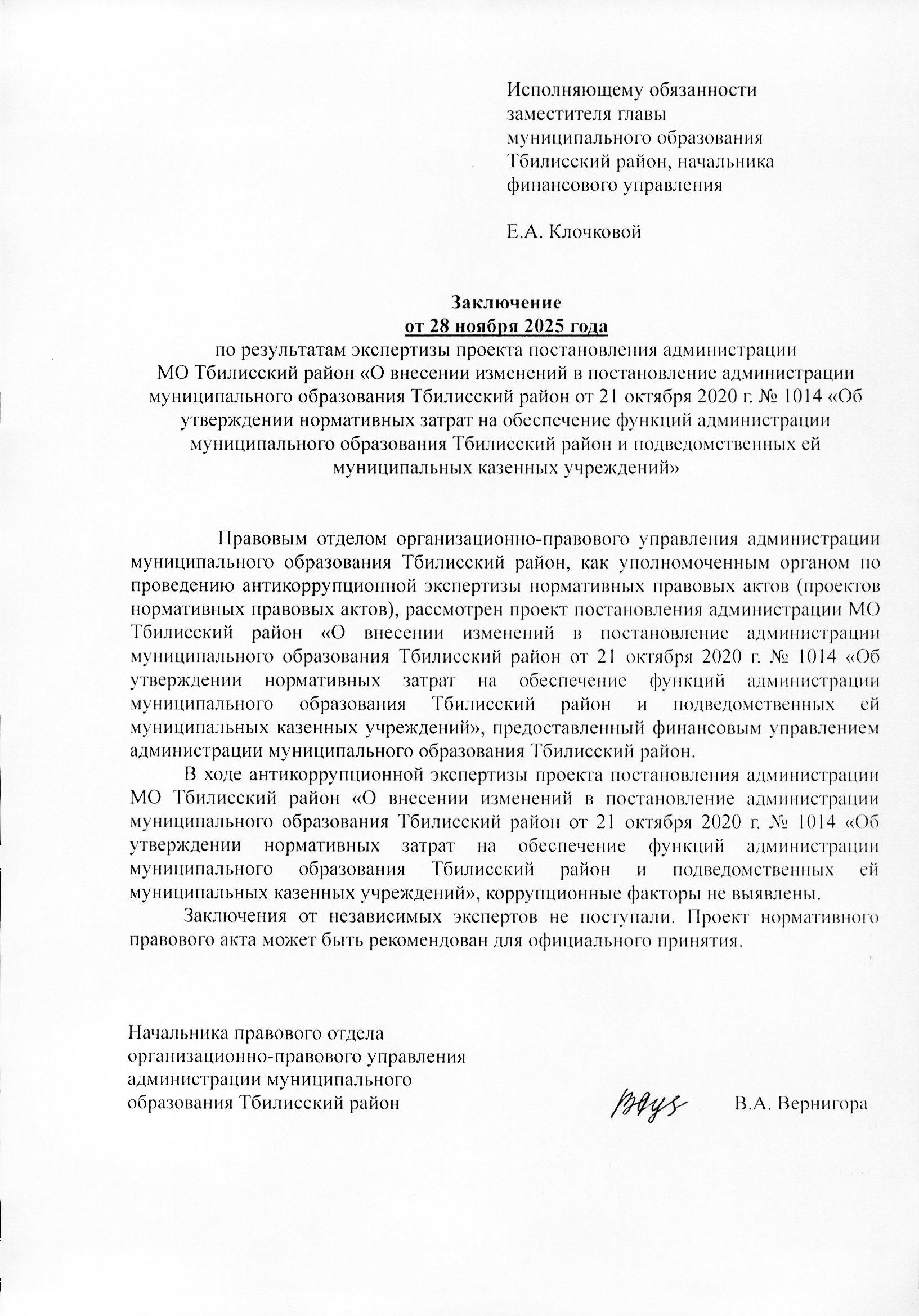 О внесении изменений в постановление администрации муниципального образования Тбилисский район от 21 октября 2020 г. № 1014 «Об утверждении нормативных затрат на обеспечение функций администрации муниципального образования Тбилисский район и подведомственных ей муниципальных казенных учреждений»