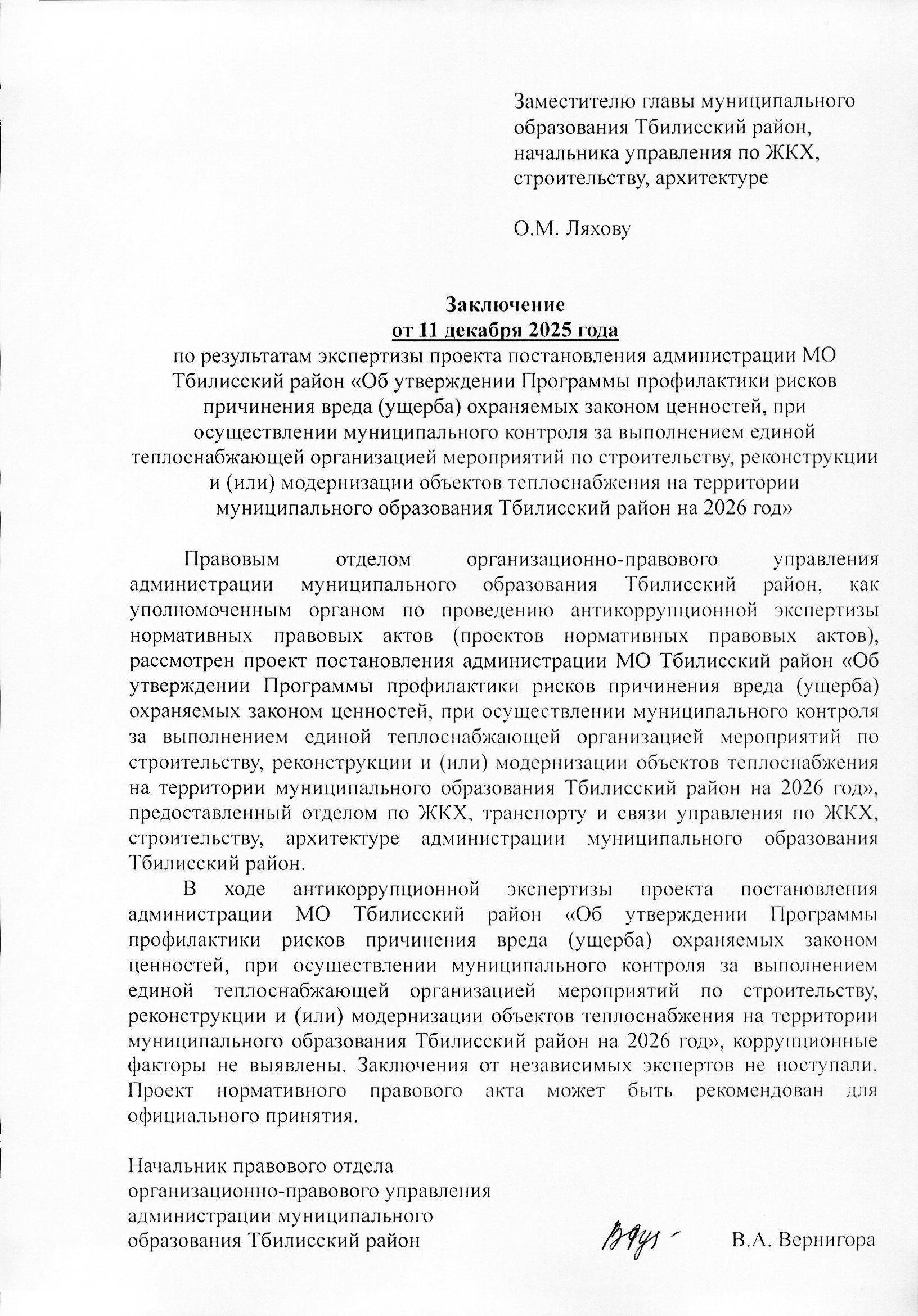 Об утверждении Программы профилактики рисков причинения вреда (ущерба) охраняемых законом ценностей, при осуществлении муниципального контроля за выполнением единой теплоснабжающей организацией мероприятий по строительству, реконструкции и (или) модернизации объектов теплоснабжения на территории муниципального образования Тбилисский район на 2026 год.