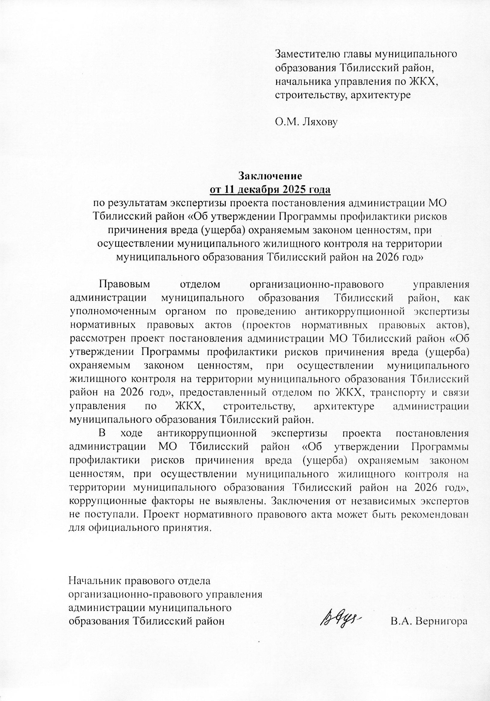 Об утверждении Программы профилактики рисков причинения вреда (ущерба) охраняемым законом ценностей, при осуществлении муниципального жилищного контроля на территории муниципального образования Тбилисский район на 2026 год