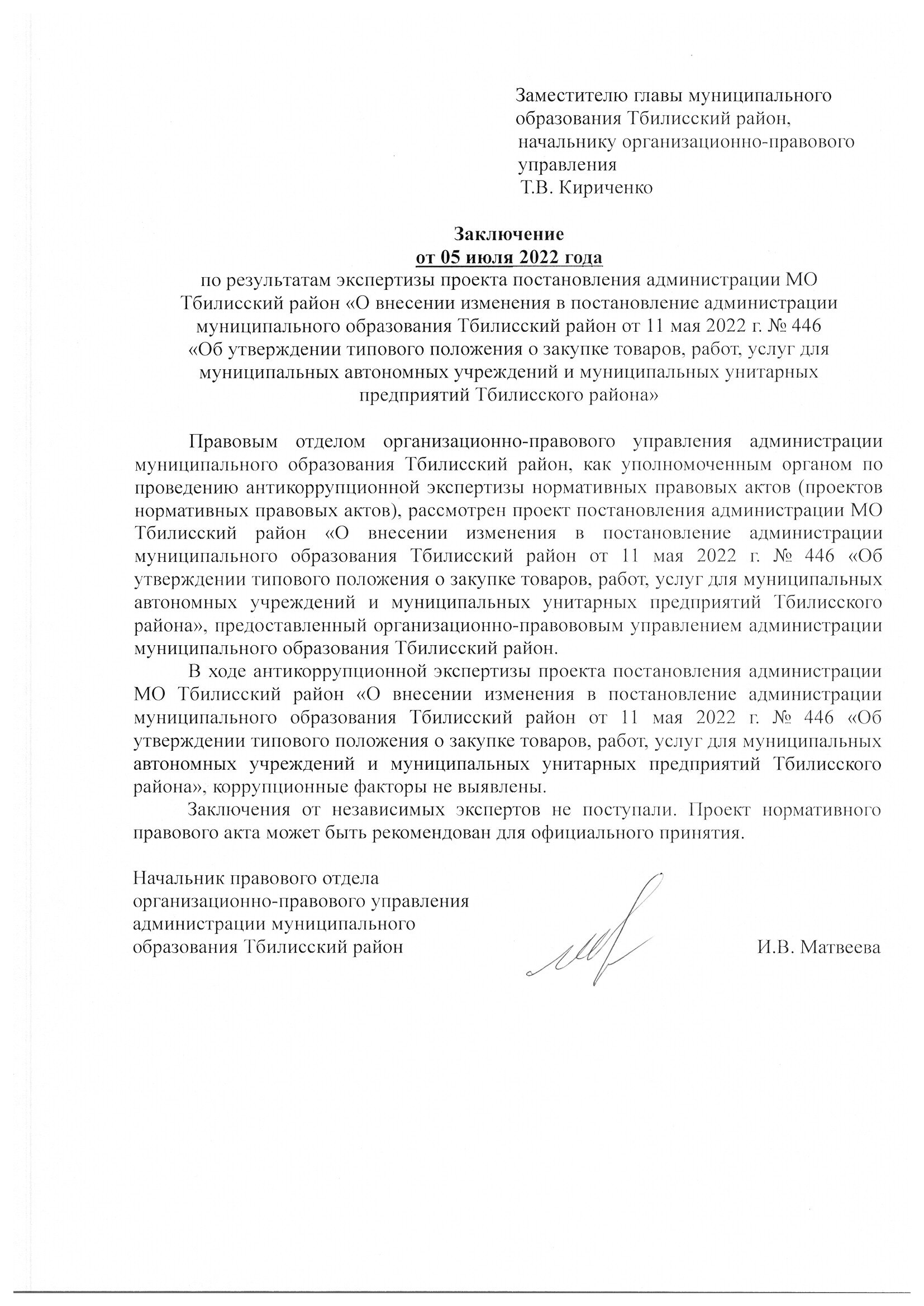 О внесении изменения в постановление администрации муниципального образования Тбилисский район от 11 мая 2022 г. № 446 «Об утверждении типового положения о закупке товаров, работ, услуг для муниципальных автономных учреждений и муниципальных унитарных предприятий Тбилисского района"