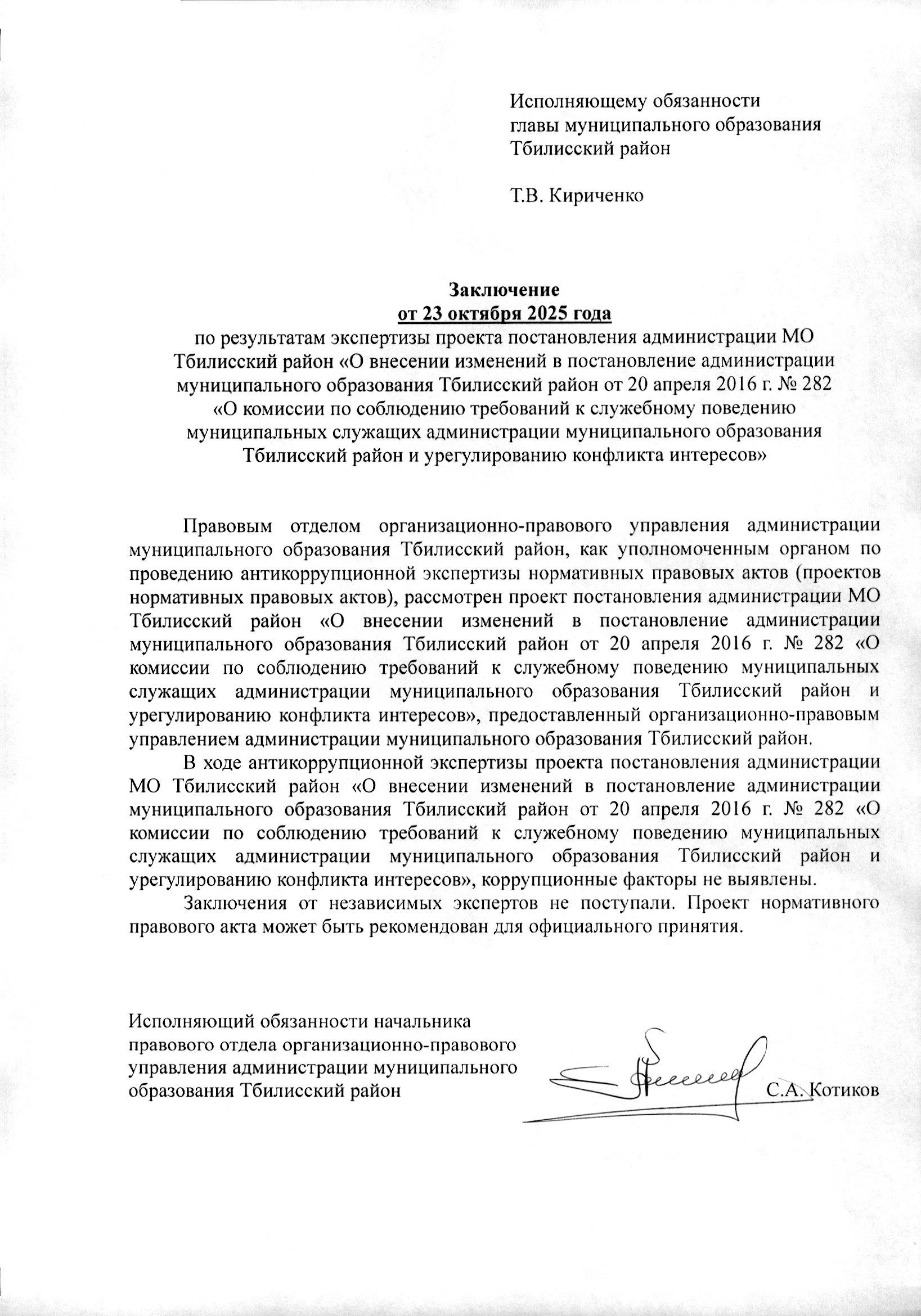О внесении изменений в постановление администрации муниципального образования Тбилисский район от 20 апреля 2016 г. № 282 «О комиссии по соблюдению требований к служебному поведению муниципальных служащих администрации муниципального образования Тбилисский район и урегулированию конфликта интересов»