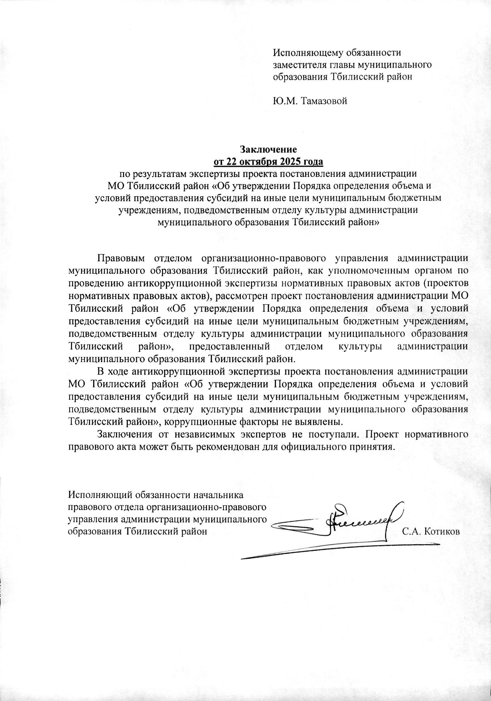 Заключение органа, уполномоченного на проведение антикоррупционной экспертизы: