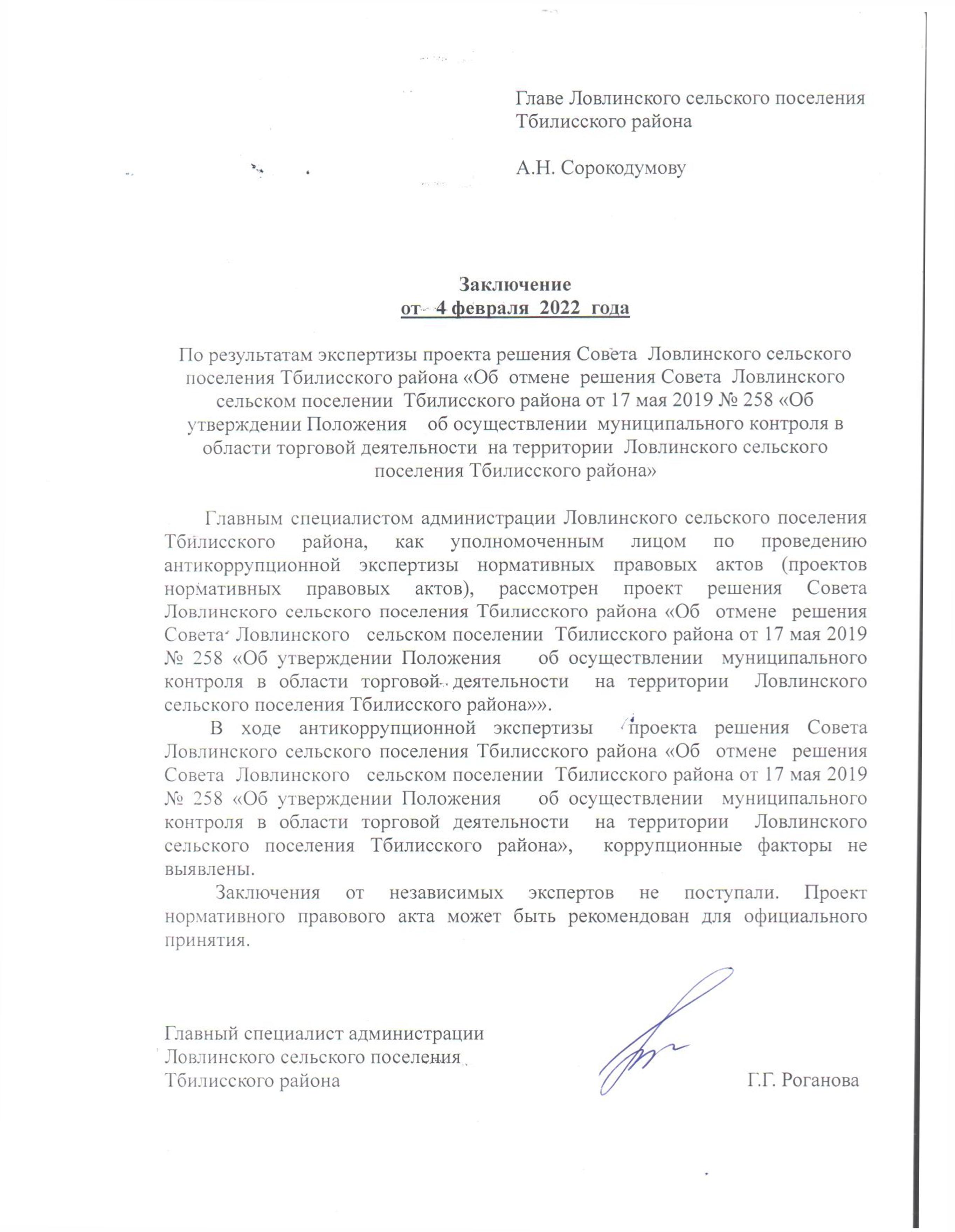 Об отмене решения Совета Ловлинского сельском поселении Тбилисского района от 17 мая 2019 № 258 «Об утверждении Положения об осуществлении муниципального контроля в области торговой деятельности на территории Ловлинского сельского поселения Тбилисского района»