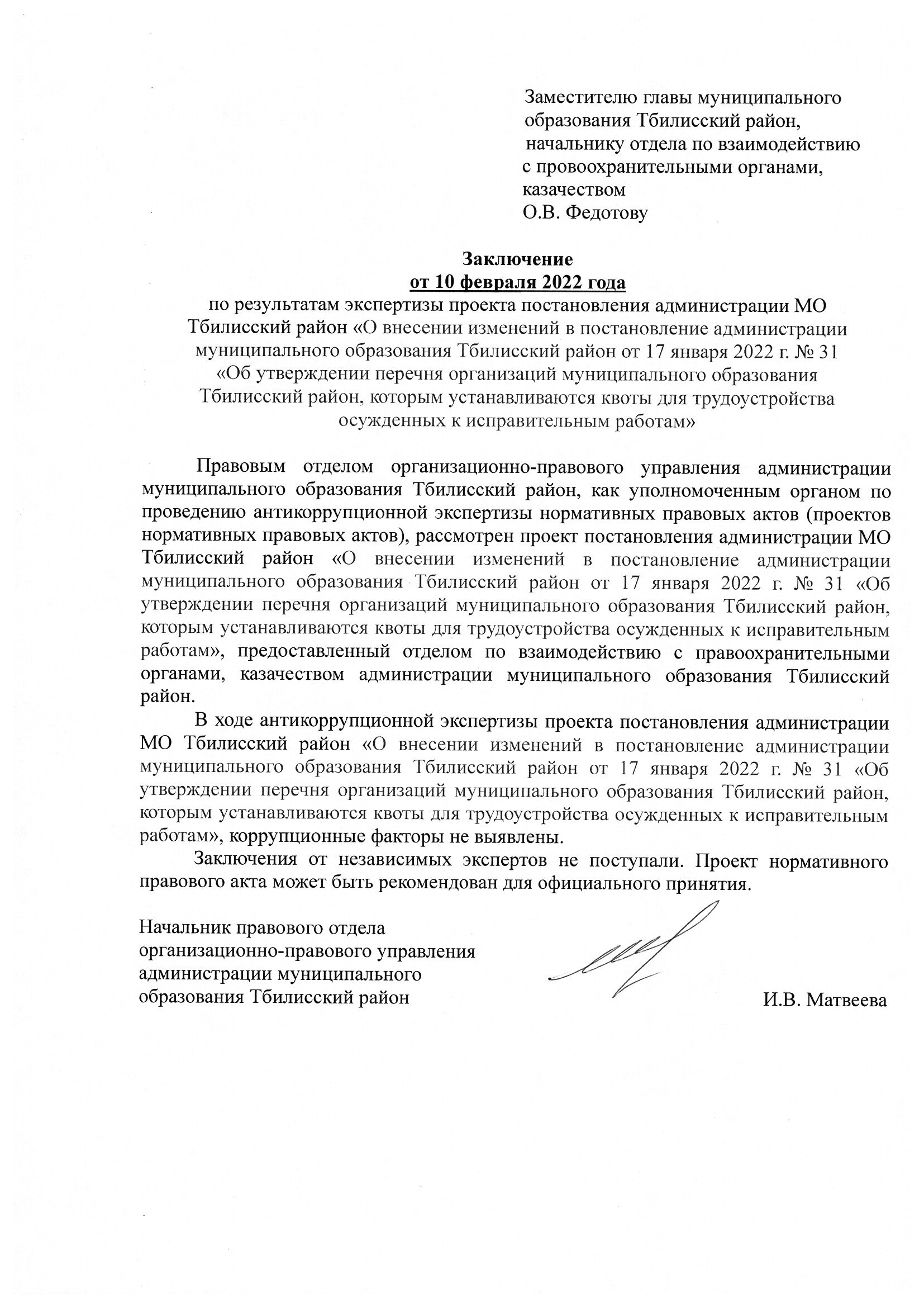 О внесении изменений в постановление администрации муниципального образования Тбилисский район от 17 января 2022 г. № 31 «Об утверждении перечня организаций муниципального образования Тбилисский район, которым устанавливаются квоты для трудоустройства осужденных к исправительным работам»