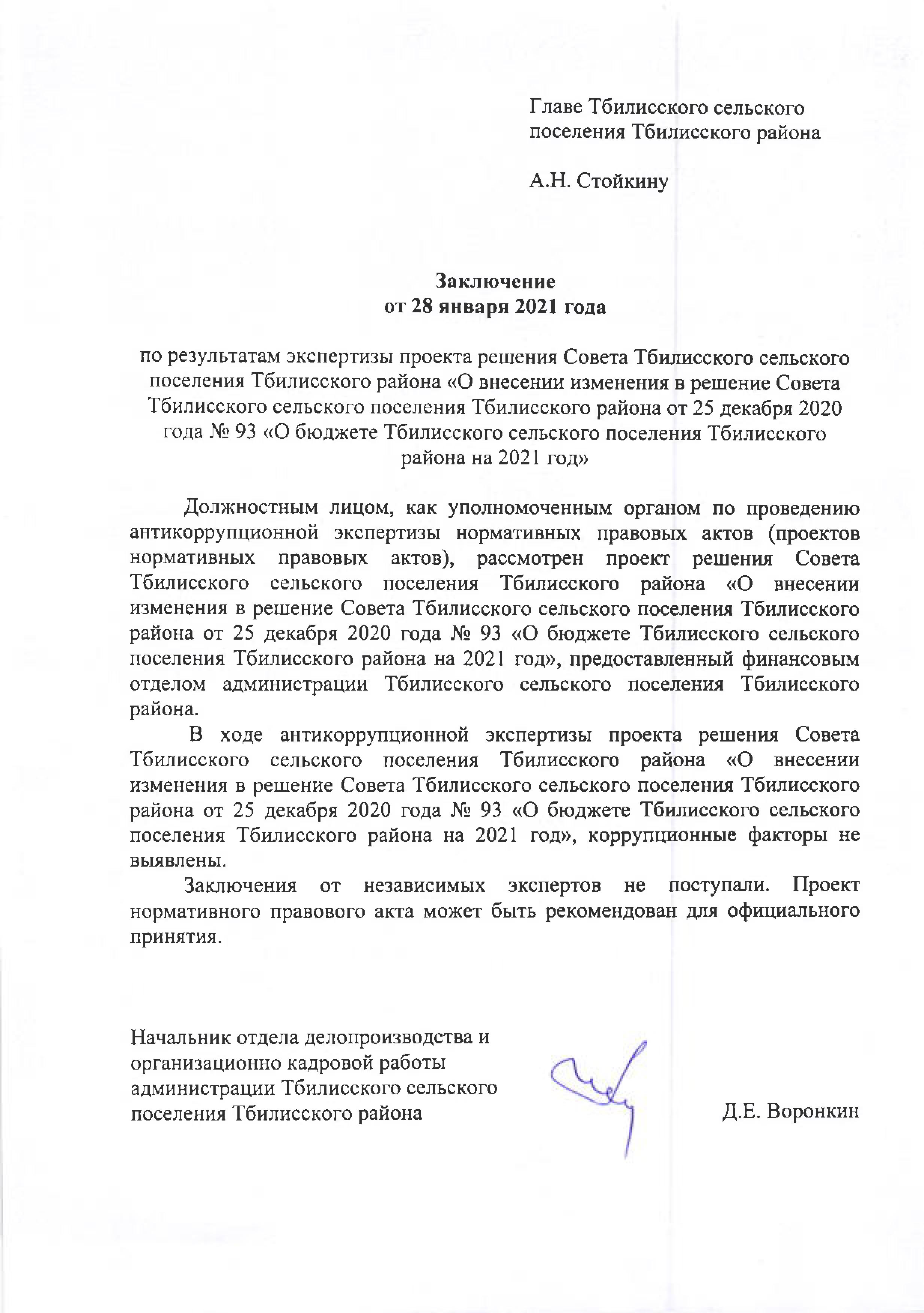 О внесении изменений в решение Совета Тбилисского сельского поселения Тбилисского района от 25 декабря 2020 года № 93 «О бюджете Тбилисского сельского поселения Тбилисского района на 2021 год»