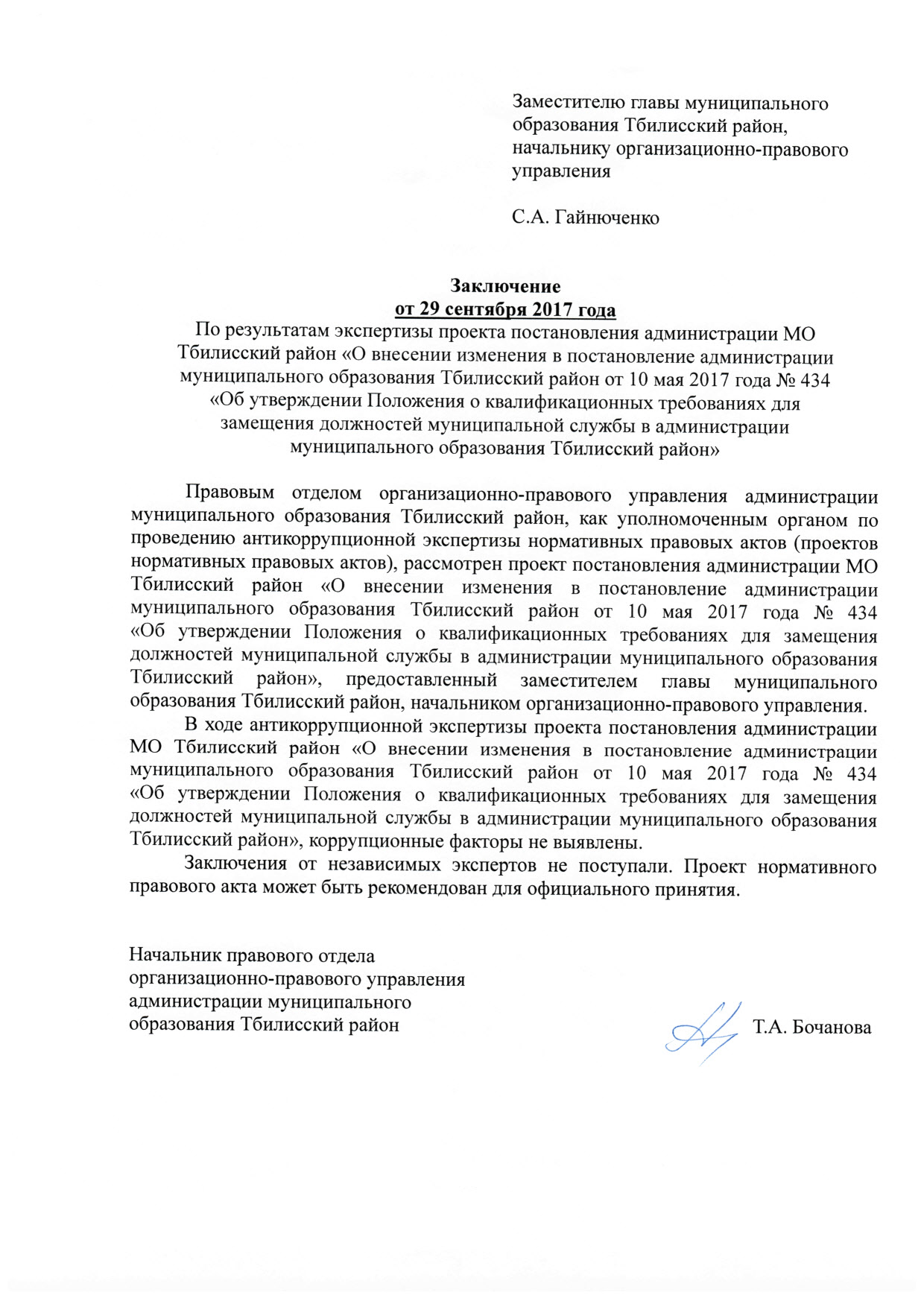 О внесении изменения в постановление администрации муниципального образования Тбилисский район от 10 мая 2017 года № 434 «Об утверждении Положения о квалификационных требованиях для замещения должностей муниципальной службы в администрации муниципального образования Тбилисский район»