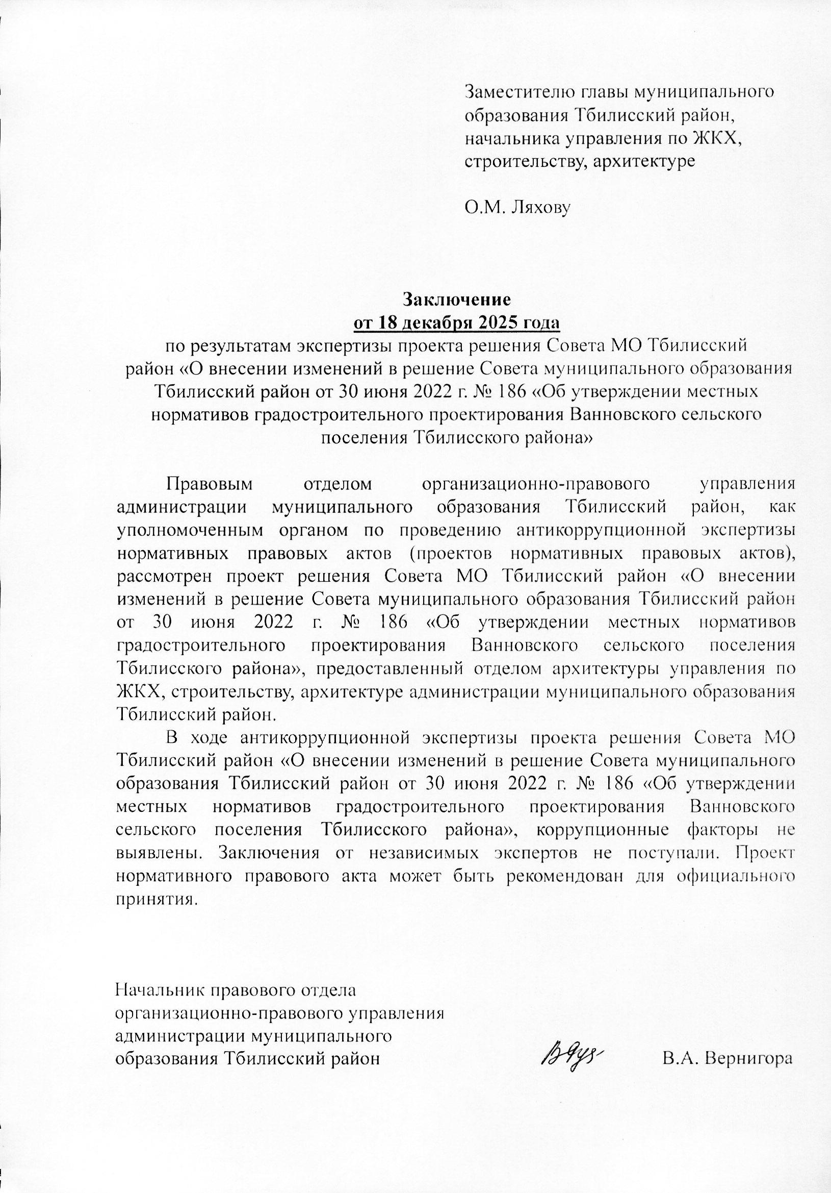 О внесении изменений в решение Совета муниципального образования Тбилисский район от 30 июня 2022 г. № 186 «Об утверждении местных нормативов градостроительного проектирования Ванновского сельского поселения Тбилисского района»