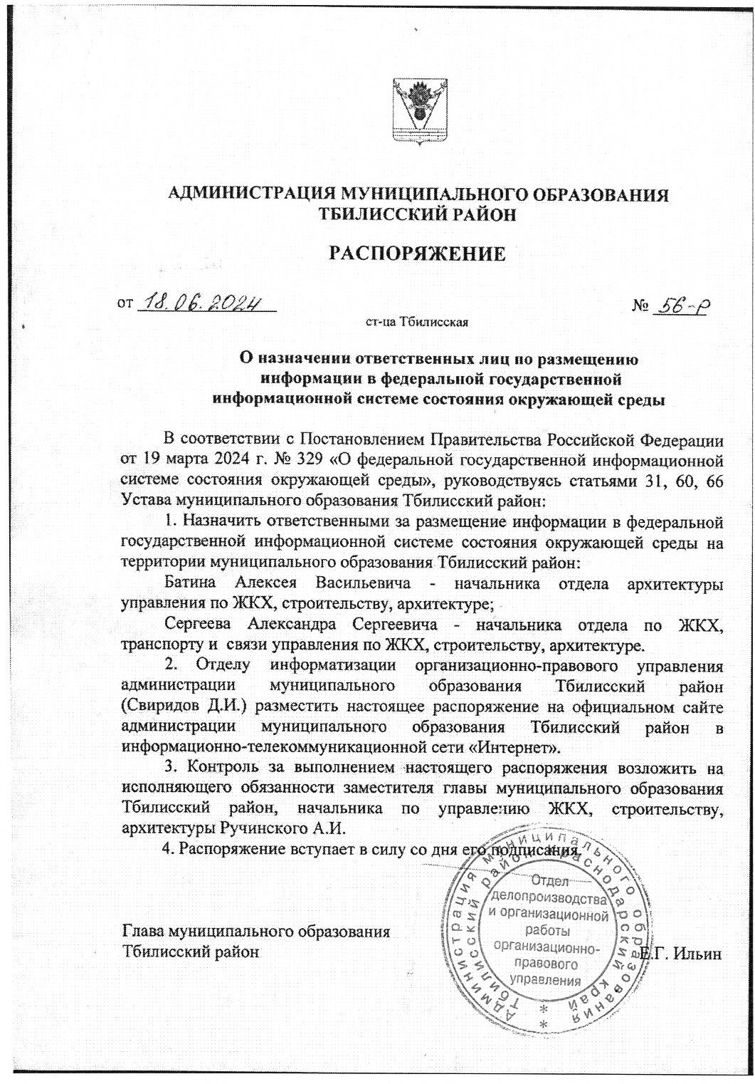 Распоряжение администрации МО Тбилисский район от 18.06.2024 г. № 56-р