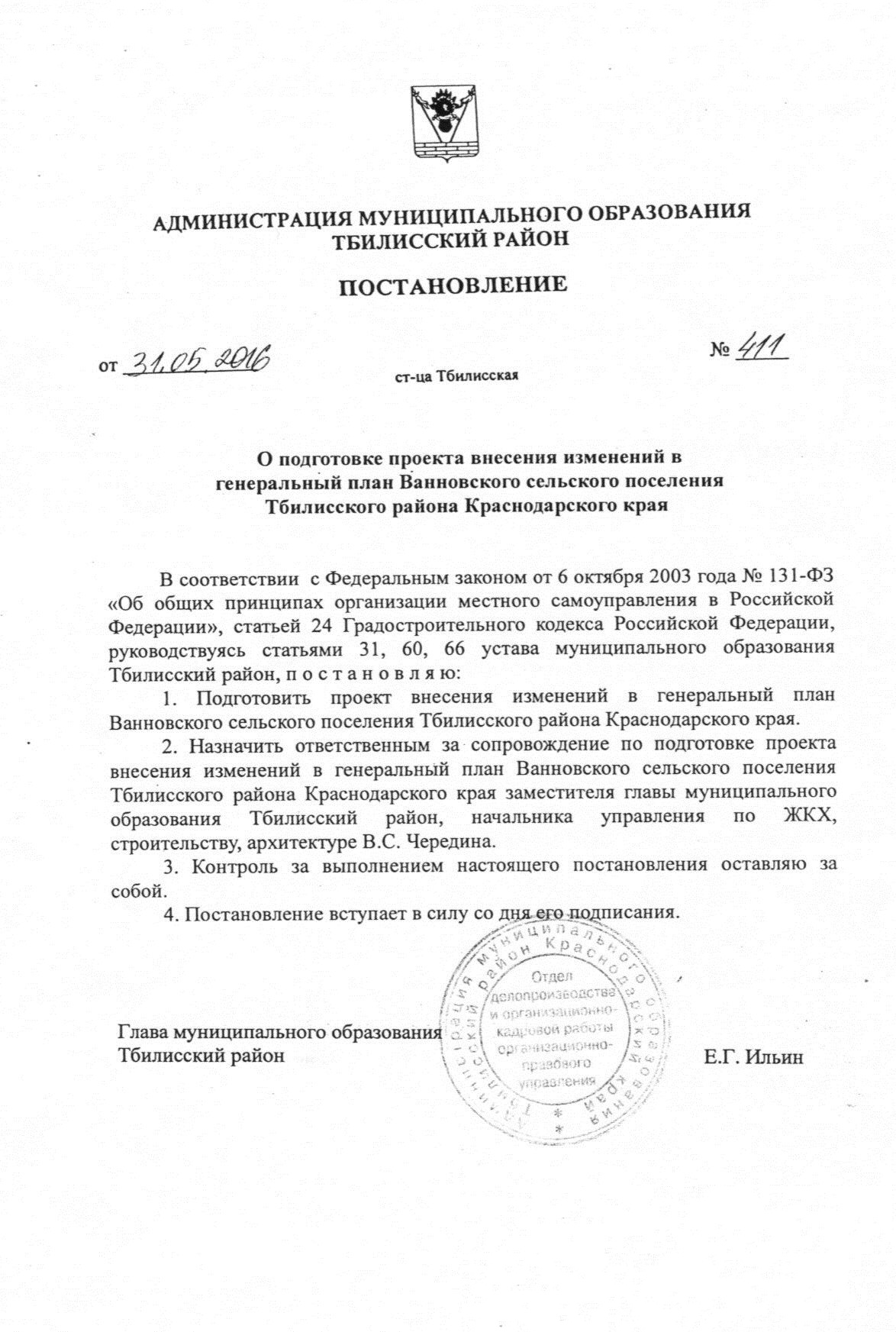 29.09.2016 Постановление администрации МО Тбилисский район от 31.05.2016 г. № 411