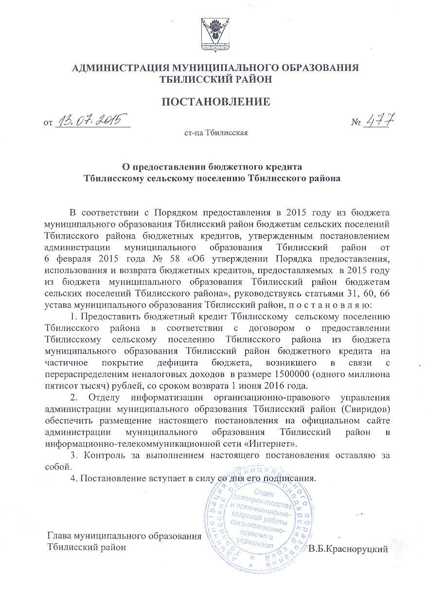 Постановление администрации МО Тбилисский район от 13.07.2015г. № 477