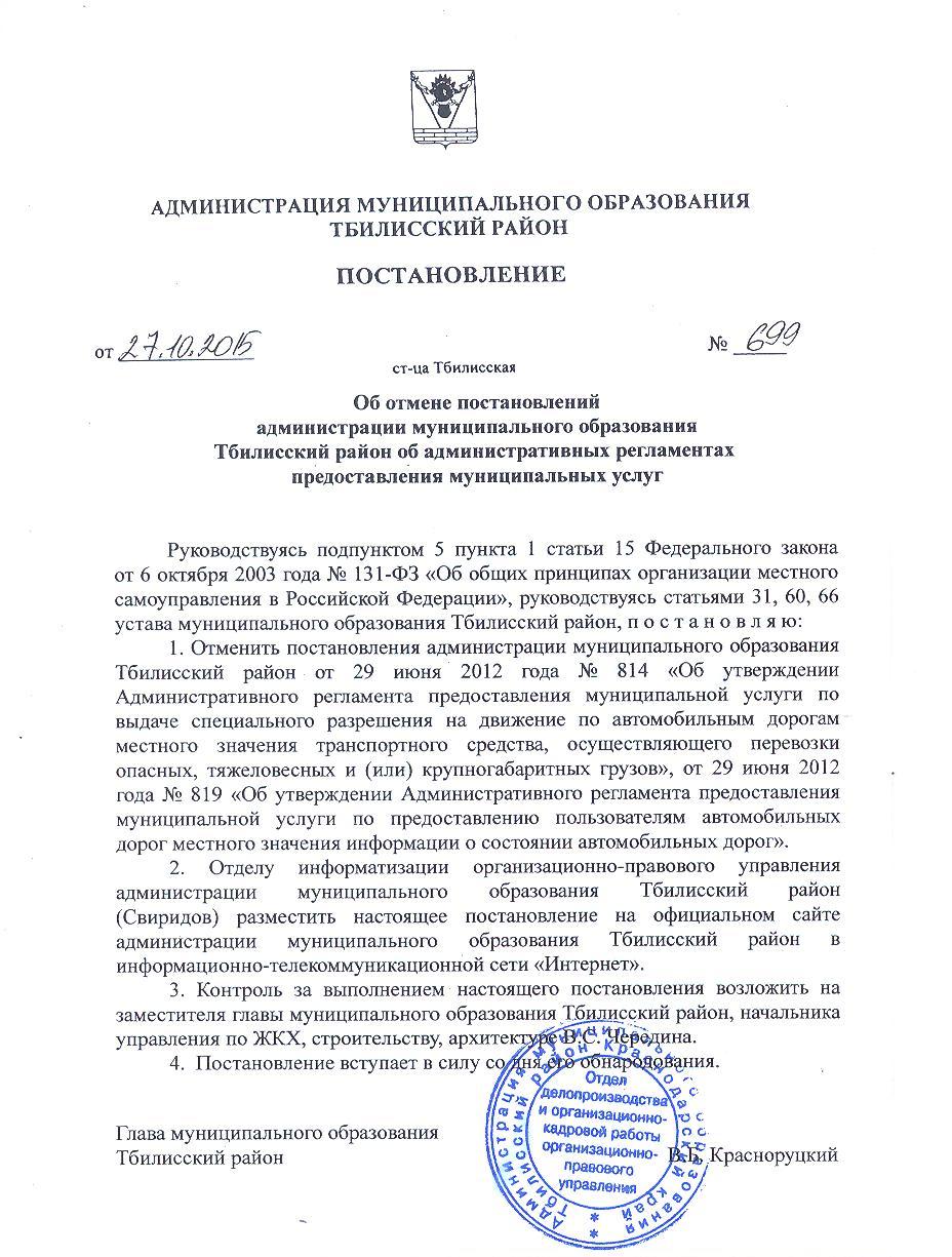 Постановление администрации МО Тбилисский район от 27.10.2015 г. № 699